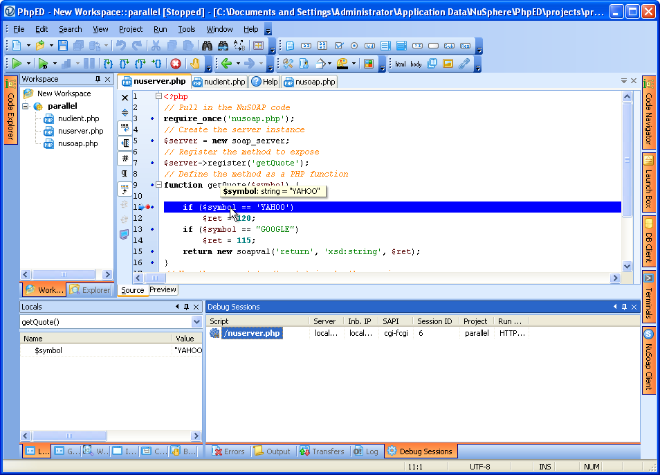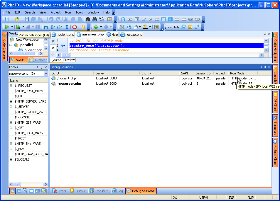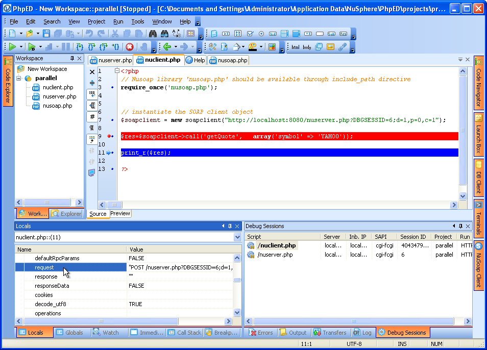 Once debugging session is started on nuclient.php the call on line 9 creates a SOAP request to nuserver.php, which in turn starts another , parallel debugging session and New Debug Session dialog comes up as shown on the figure: