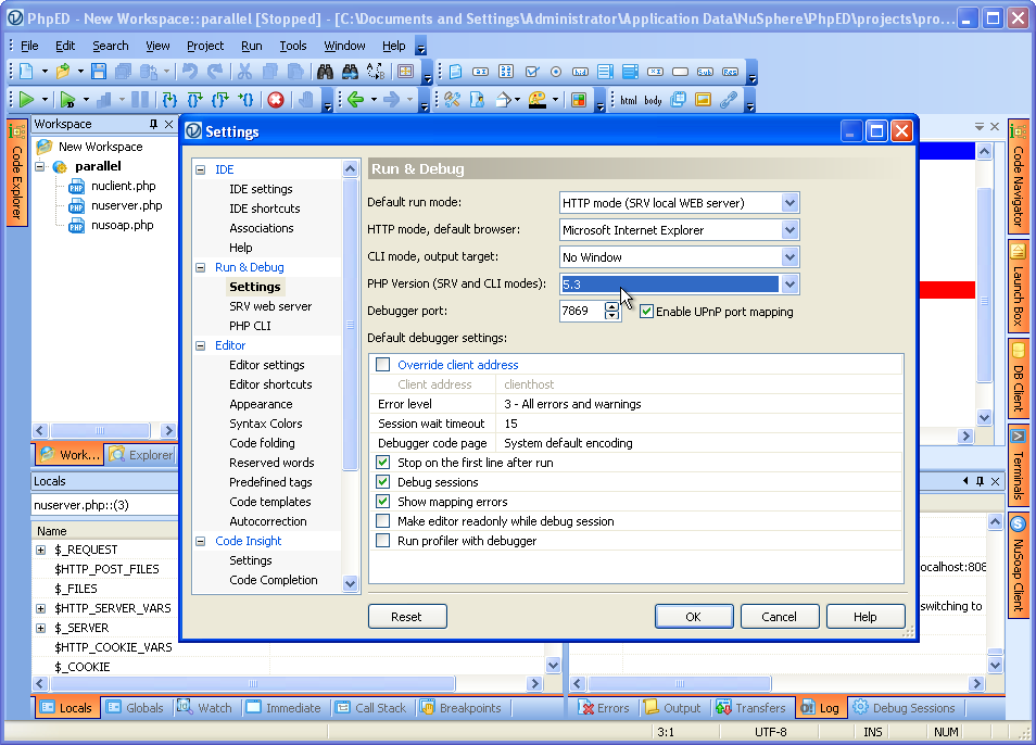 PhpED provides an ability to debug multiple PHP scripts in parallel. This is made possible by Parallel debugging and turning on Debugging Sessions available in our PHP IDE. An example shown below is the default debugging settings: