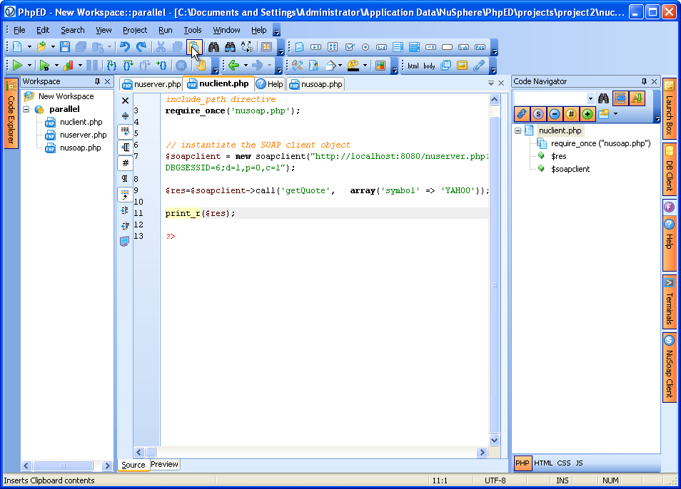 Our first example uses NuSphere's well known NuSoap PHP class to create simple SOAP Server and Client scripts - nuserver.php and nuclient.php, as shown below: